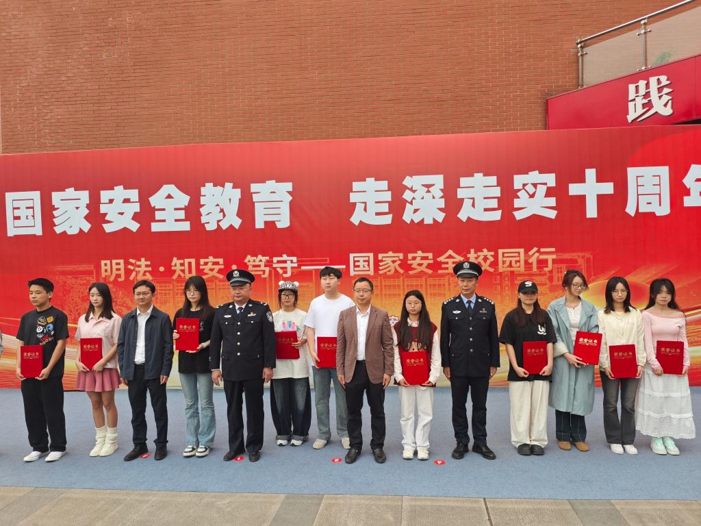 校警聯(lián)動共筑安全防線。4月15日上午,“校警共建護(hù)國安”宣傳暨2025年大學(xué)生國家安全素養(yǎng)展示獲獎作品頒獎儀式在藝術(shù)傳媒大樓廣場隆重舉行。儀式由副校長陳光平主持,市公安局副局長沈曉,市委辦副主任宿都,市公安局政保支隊支隊長譚清福,達(dá)州市公安局宣傳科、達(dá)州日報、自媒體、電視臺等媒體代表、相關(guān)業(yè)務(wù)警種民警代表以及我校部分師生代表出席活動。
