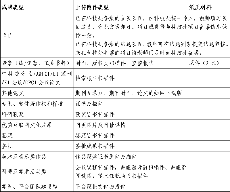 (二)其他科研成果類別:橫向項目類,科研論文類,著作類,鑒定、成果要報類,專利、軟件著作權(quán)和標(biāo)準(zhǔn)類,科研獲獎類,藝體競賽獲獎類、創(chuàng)作與競技成果類,優(yōu)秀互聯(lián)網(wǎng)文化成果類,科普及學(xué)術(shù)活動類,學(xué)科、平臺團隊建設(shè)類。