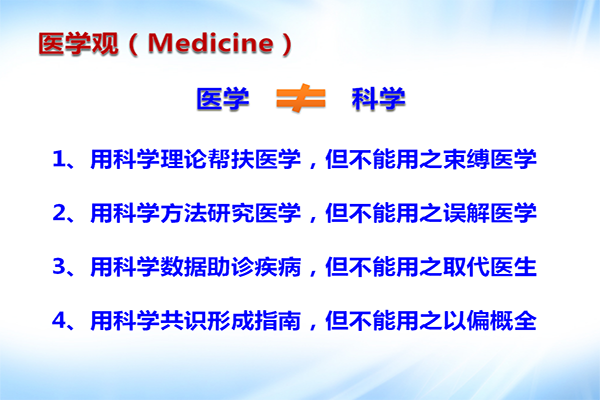 樊代明院士講到:“形而上為哲學(xué)、形而下是科學(xué),形而中為醫(yī)學(xué)。”醫(yī)學(xué)不等于科學(xué)。它非常復(fù)雜,“上下”聯(lián)通,同時還涉及社會學(xué)、人類學(xué)、心理學(xué)、法學(xué)、經(jīng)濟學(xué)、藝術(shù)等。而且,醫(yī)學(xué)非常注重結(jié)局,“有效無效,能不能治病,才是醫(yī)學(xué)的根本”。因此,用科學(xué)的理論幫扶醫(yī)學(xué),但不能用之束縛醫(yī)學(xué);用科學(xué)的方法研究醫(yī)學(xué),但不能用之誤解醫(yī)學(xué);用科學(xué)的數(shù)據(jù)助診疾病,但不能用之取代醫(yī)生;用科學(xué)的方法形成指南,但不能用之以偏概全。