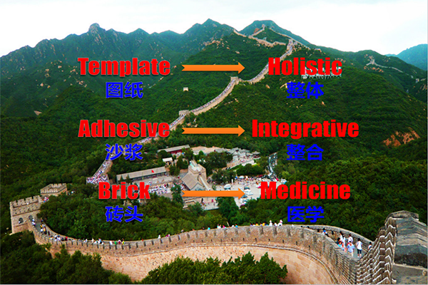 樊代明院士認為,整合醫(yī)學(xué)應(yīng)該是以人為本,從人的整體出發(fā),將醫(yī)學(xué)各領(lǐng)域最先進的知識理論和臨床各專科最有效的實踐經(jīng)驗分別加以有機整合,并根據(jù)社會、環(huán)境、心理的現(xiàn)實進行修整、調(diào)整,使之成為更加符合、更加適合人體健康和疾病治療的認識論、方法學(xué),其實施的結(jié)果是創(chuàng)造一種新的醫(yī)學(xué)知識體系。它至少包括三個方面:整體觀、整合觀、醫(yī)學(xué)觀。創(chuàng)造新的醫(yī)學(xué)知識體系,就像建造萬里長城,它需要三個因素:一是圖紙或模型(Template),一是沙漿(Adhesive),一是磚頭(Brick)。三者必須同時具備,強調(diào)任何一個因素都是建不了或建不好萬里長城的,而這當中最重要的是人。