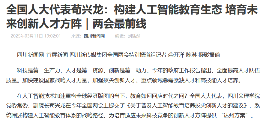 在人工智能技術(shù)加速重構(gòu)全球經(jīng)濟(jì)版圖的當(dāng)下,教育如何回應(yīng)時代之問?全國人大代表,四川文理學(xué)院黨委常委、副院長茍興龍在今年全國兩會上提交了《關(guān)于普及人工智能教育培養(yǎng)拔尖創(chuàng)新人才的建議》,系統(tǒng)闡述構(gòu)建人工智能教育體系的戰(zhàn)略路徑,為培育適應(yīng)未來科技競爭的創(chuàng)新人才方陣提供 “達(dá)州方案”。