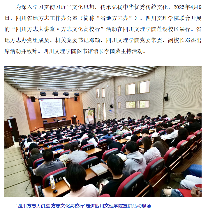 為深入學(xué)習(xí)貫徹習(xí)近平文化思想,傳承弘揚(yáng)中華優(yōu)秀傳統(tǒng)文化,2025年4月9日,四川省地方志工作辦公室(簡(jiǎn)稱“省地方志辦”)、四川文理學(xué)院聯(lián)合開(kāi)展的“四川方志大講堂·方志文化高校行”活動(dòng)在四川文理學(xué)院蓮湖校區(qū)舉行。省地方志辦黨組成員、機(jī)關(guān)黨委書(shū)記鄧瑜,四川文理學(xué)院黨委常委、副校長(zhǎng)鄧杰出席活動(dòng)并致辭。四川文理學(xué)院圖書(shū)館館長(zhǎng)李國(guó)榮主持活動(dòng)。
