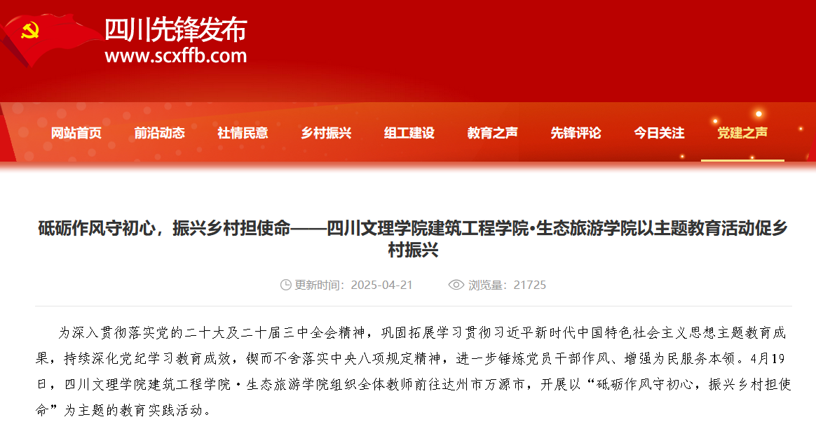 為深入貫徹落實(shí)黨的二十大及二十屆三中全會(huì)精神,鞏固拓展學(xué)習(xí)貫徹習(xí)近平新時(shí)代中國(guó)特色社會(huì)主義思想主題教育成果,持續(xù)深化黨紀(jì)學(xué)習(xí)教育成效,鍥而不舍落實(shí)中央八項(xiàng)規(guī)定精神,進(jìn)一步錘煉黨員干部作風(fēng)、增強(qiáng)為民服務(wù)本領(lǐng)。4月19日,四川文理學(xué)院建筑工程學(xué)院·生態(tài)旅游學(xué)院組織全體教師前往達(dá)州市萬(wàn)源市,開展以“砥礪作風(fēng)守初心,振興鄉(xiāng)村擔(dān)使命”為主題的教育實(shí)踐活動(dòng)。