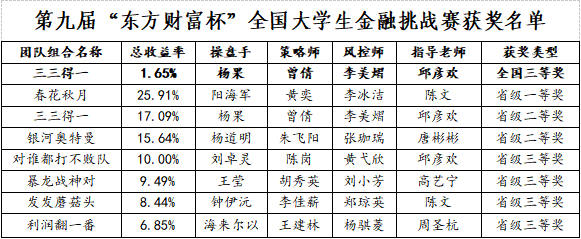 近日,由共青團中央青年發(fā)展部主辦的第九屆“東方財富杯”全國大學生金融挑戰(zhàn)賽拉下帷幕。我院共96人參加大賽,在經歷了激烈的比賽后,最終1支隊伍獲得全國三等獎,1支隊伍獲得省級一等獎,2支隊伍獲得省級二等獎,4支隊伍獲得省級三等獎。