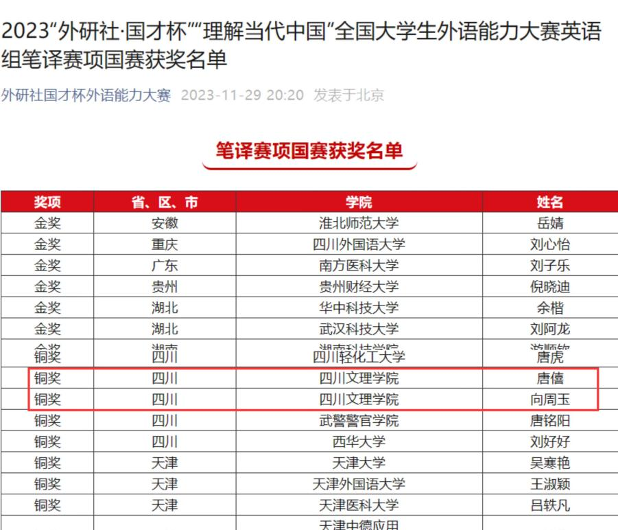 外國(guó)語(yǔ)學(xué)院2020級(jí)翻譯專(zhuān)業(yè)的唐僖、向周玉同學(xué)進(jìn)入了全國(guó)決賽,桂宙老師擔(dān)任其指導(dǎo)老師。在經(jīng)歷了兩小時(shí)的線上比賽后,兩位同學(xué)最終代表四川文理學(xué)院獲得筆譯組全國(guó)決賽銅獎(jiǎng)。