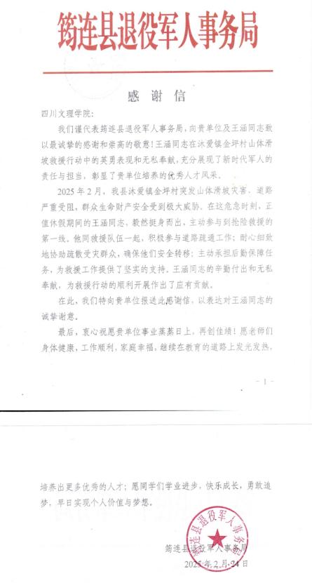 2月24日,宜賓市筠連縣退役軍人事務(wù)局向?qū)W院發(fā)來一封感謝信,高度贊揚(yáng)文學(xué)與傳播學(xué)院王涵同學(xué)在2月沐愛鎮(zhèn)金坪村山體滑坡救援中的突出表現(xiàn)。