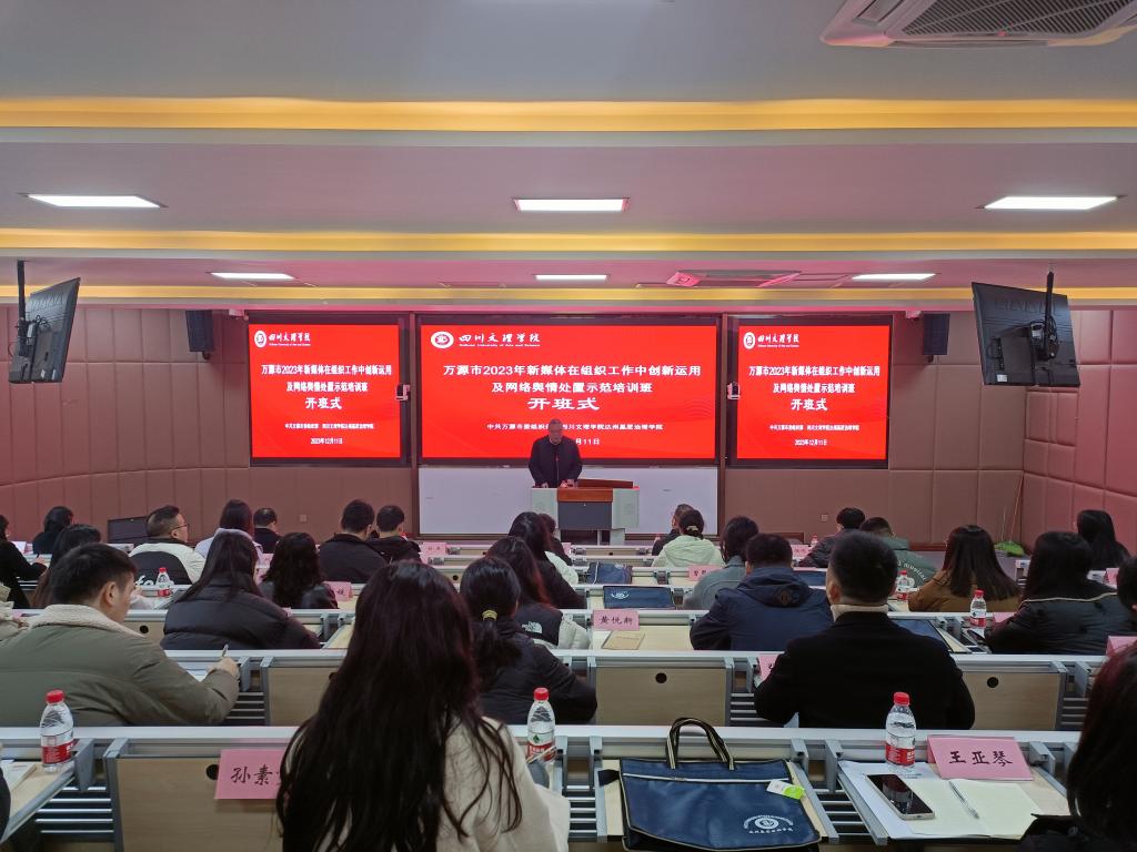 12月11日,萬源市2023年新媒體在組織工作中創(chuàng)新運(yùn)用及網(wǎng)絡(luò)輿情處置示范培訓(xùn)班開班儀式在我校舉行。此次培訓(xùn)班由萬源市委組織部主辦,四川文理學(xué)院達(dá)州基層治理學(xué)院承辦。副校長徐曉宗致辭、萬源市文化體育和旅游局副局長朱小平講話,馬克思主義學(xué)院院長、達(dá)州基層治理學(xué)院副院長孫杰主持開班式。