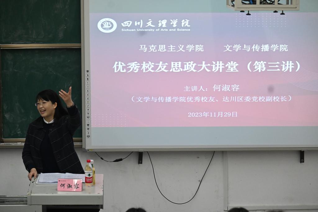 11月29日下午,文學與傳播學院與馬克思主義學院于藝術傳媒樓1028教室聯(lián)合舉行“雙周學術講座”暨“優(yōu)秀校友思政講座”。本次講座由文學與傳播學院優(yōu)秀校友、達川區(qū)委黨校副校長何淑容主講,文學與傳播學院2023級漢語言文學專業(yè)同學、學生黨支部黨員及入黨積極分子代表現(xiàn)場聆聽講座。
