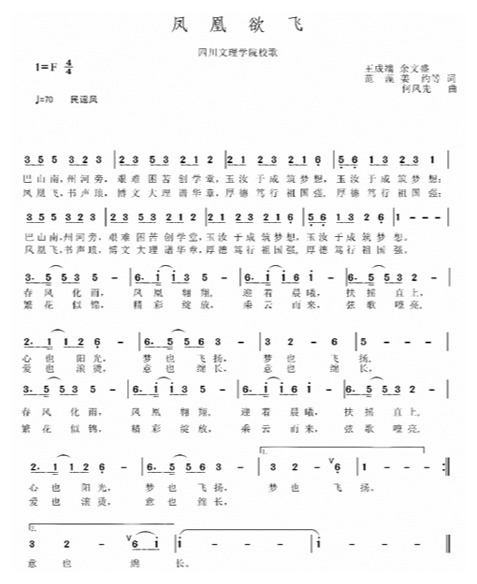 四川文理學院校歌《鳳凰欲飛》,2017年9月完成詞曲創(chuàng)作,在四川省第八屆大學生藝術(shù)節(jié)上獲專業(yè)組一等獎,在第十四屆中國合唱節(jié)上獲銀獎。鳳凰在漢文化中是吉祥、勇敢、和諧、幸福的化身,是剛強勇敢、才智超群、幸福美滿、生生不息的象征?!而P凰欲飛》取鳳凰在浴火中重生,積蓄足夠能量,意欲展翅翱翔于九天之勢,喻指四川文理學院如同鳳凰翔集的梧桐林,千萬學子云集于斯,師生同心同德,篤行博文大理、厚德篤行的校訓,經(jīng)風沐雨,為祖國富強、社會進步,嘔心歷膽,譜寫生命華章。曲詞分為兩章,第一章敘寫學校地理區(qū)位和辦學緣起,以及源遠流長的辦學歷史和悠久的文化底蘊;第二章表達學校的辦學理念,人才培養(yǎng)目標和文理交融的理想人才標準;結(jié)尾部分抒寫文理學子對母校的感恩之情與對燦爛如花的未來的無限憧憬。《鳳凰欲飛》由王成端、余文盛、范藻、姜約等集體作詞,何鳳先作曲。
